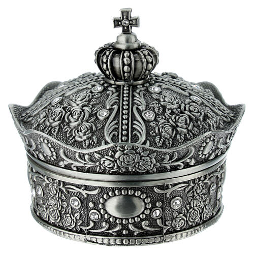 Crown rosary box, 6x6 cm. Elegant metal rosary box, finely decorated with rose patterns, swirls, and sparkling zircons, enhancing its preciousness and charm. It has dimensions of 6.5 cm in height and 5.7 cm in circumference, it is perfect for keeping your rosary safe, protecting it stylishly. The weight of the rosary box is 120.8 g.