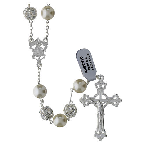 Beautiful silver rosary with 10mm beads consisting of pearls and spheres with alternating white crystals set, a centerpiece decorated with images of Mary and Jesus on both sides and a cross with the body of Christ.This rosary is made in Italy in a company that boast more than a decade of experience in the processing of silver. Its craftsmen work the item completely by hand from start to finish.The rosary comes in a practical rosary box and is wearable.Jewel weight 83.2 grams.