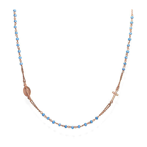 Amen rosé necklace ice blue beads cross Miraculous Mary.The choker necklace with a circumference ranging from 45 cm to 47 cm, is made of 925 silver rosé.It has a snap hook closure, the beads are crystal ice blue, with a diameter of about 2 mm and two charms are inserted along the length of the necklace (not pendants, of 1 cm each) of the Miraculous Madonna medal and a cross .The weight of the necklace is 4.9 grams.