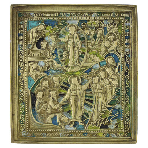 Antique Russian travel icon Descent into Hell and Resurrection of Christ, 19th century, 5 x 4.5 cm. Small Russian travel icon in bronze with enamels depicting the Descent into Hell and the Resurrection of Christ, the central scene of the Christian faith symbolizing victory over death and the redemption of humanity. Christ is shown freeing Adam and Eve from the underworld, an action that expresses universal salvation and the hope of eternal life.