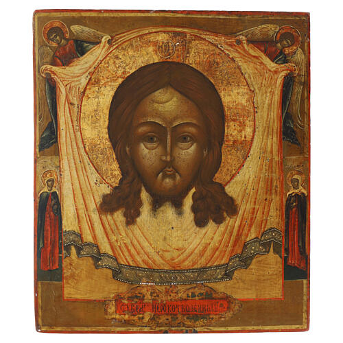 Antique Russian icon depicting the Face of Christ Acheiropoieta, known as the “Savior not painted by human hands”, one of the most significant images of the Eastern Christian tradition. According to tradition, the image of Christ’s face miraculously appeared on a linen cloth called the Mandylion, sent to King Abgar of Edessa. Christ, having wetted his face, dried it with the cloth, leaving his features impressed on it and creating the first Acheiropoieta image, not made by human hand. In 944 the...