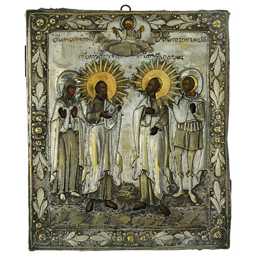 Antique Russian Icon 19th Century Saints Peter, Paul, Anna, and Ozon Brass Riza 31.5x26 cm