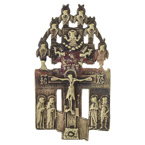 Antique Russian Orthodox bronze crucifix, early 18th century, 14 x 7.5 cm. An authentic example of Russian devotional tradition, the cross features the characteristic three-bar structure, with the lower bar inclined, the symbol of the “Scales of justice”: on one side the Good Thief welcomed into Paradise, on the other the Bad Thief turning away from salvation. The lower register contrasts the fallen Old Jerusalem with the New Jerusalem, while at the base Mount Golgotha is depicted along with the skull of Adam, a powerful symbol of humanity’s redemption through Christ’s sacrifice. Incised inscriptions recall the salvific meaning of the Cross, the place where “the site of the Crucified One becomes Paradise.” The iconography is rich and finely modelled: in addition to the central Crucifixion, numerous Gospel scenes and sacred figures appear in relief, including episodes from the life of Christ and representations of the Trinity, all enhanced by decorative motifs typical of Russian production of the period. In the Eastern tradition Christ is portrayed with regal composure, not in the spasm of suffering but in the glory of victory over death, making this crucifix both a precious historical object and a profound aid to spiritual meditation. The piece is accompanied by an expert appraisal and is delivered in an elegant blue presentation case that further enhances its collectible value.