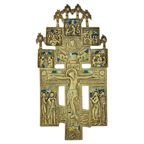 Antique Russian Orthodox Crucifix, 19th Century of Bronze and Enamels, 22 x 14 cm. An impressive Russian Orthodox bronze crucifix, embellished with yellow and green enamel, a significant example of Eastern European devotional tradition. Its structure follows the typical form of the Russian three-barred cross, featuring a slanted lower bar that symbolizes the "Scales of Justice": on one side, it points toward the Good Thief ascending to Paradise; on the other, toward the Bad Thief turning away from salvation. The lower section depicts symbolic elements representing both the earthly Jerusalem and the New Jerusalem, while the base features Mount Golgotha surmounted by the skull of Adam, symbol of humanity's redemption through the sacrifice of Christ. The engraved inscriptions evoke the salvific significance of the Cross, the place where "the site of the Crucified One becomes Paradise." The iconography is rich and detailed: in addition to the Crucifixion itself, the piece features various Gospel scenes; such as the Annunciation, the Adoration of the Magi, the Entry into Jerusalem, and the Trinity, all finely rendered in relief and embellished with floral motifs and enamels that lend a luminous quality to the composition. In keeping with Eastern tradition, Christ is depicted with regal composure, not in suffering, but in the glory of His victory over death, making this crucifix not merely an artistic object, but also a powerful aid for spiritual meditation. The orthodox crucifix is delivered in an elegant blue velvet case and is accompanied by an expert appraisal certificate.