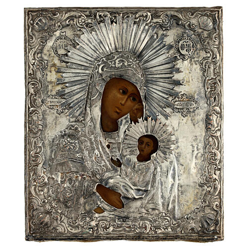 Assuage My Sorrows icon ancient early 1800s Russia 32x28 cm.Ancient Russian icon from Moscow dating back to the beginning of the 19th century, covered by an intricately decorated riza. The name of this icon comes from the fifth verse of the Akathist hymn ''Console my soul's pain''. The icon depicts the intimate suffering of Mary who saw her only son die unjustly on Golgotha. Mary lived those long years of pain, loneliness and abandonment until she received the consolation of her sentence in the Dormition.In the work she is represented with her right hand at her temple sad and thoughtful with Christ floating freely in her mantle, as if she lived in an incorporeal dimension. In the cartouche appears an inscription that quotes ''Judge according to justice, operate with mercy and magnanimity''.The Assuage my Sorrows Icon of the Mother of God is shipped together with a velvet and blue satin box and an appraisal made by a registered expert.