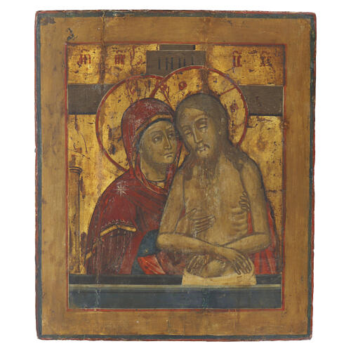 Antique Russian icon depicting 'Don't Weep for Me, Mother', part of the Imago Pietatis iconographic tradition. This theme originated in Constantinople in the 12th century and is linked to the devotion surrounding the Shroud as venerated in Hagia Sophia. Christ appears dead yet upright in the tomb, head inclined: a representation that evokes both the Passion and the mystery of redemption. This image presents Christ as the Bridegroom who, through the sacrifice of the Cross, generates the new human...