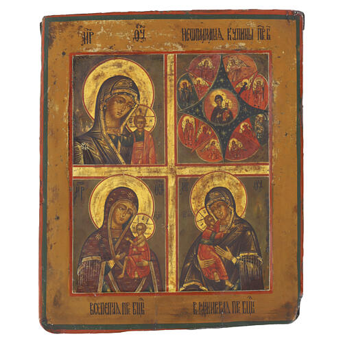 Russian four-panel Quadripartite icon depicting four celebrated images of the Mother of God from the Orthodox tradition: Our Lady of Kazan, the Unburnt Bush (Burning Bush), Panagia Pantanassa (All‑Praised), and Our Lady of Vladimir. This composition brings together on a single panel some of the most venerated Marian representations in Russian spirituality, each bearing profound theological and devotional meaning. The Mother of God of Kazan is one of Russia's most important icons and was lon...
