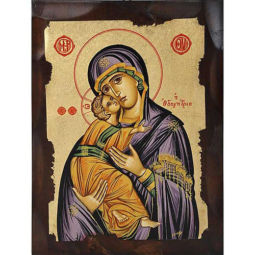 A beautiful image of the Virgin with a radiant violet dress. The Odighitria is the Virgin who shows the way, the way of salvation is Jesus. Screen-printing applied on a treated wood plate.