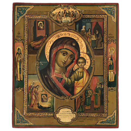 Our Lady of Kazan icon painted on old 19th century wood 44x38cm.Modern Russian icon made on an ancient wooden board on which a gold leaf has been applied and hand painted with the egg tempera technique.The icon presents the Madonna with baby Jesus in her arms, in the central part, the Trinity at the top, St Maria and St Barbara, on the sides, and 4 scenes relating to the Mother of God of Kazan, next to the central figure.The representations are separated from each other by a beautiful decoration...