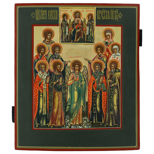 Russian orthodox icon on an antique panel depicting the Guardian Angel and Saints in adoration. Inspired by the tradition of the Pechersk Lavra Monastery in Ukraine, where the Guardian Angel and Saints are often depicted venerating the Mother of God as a symbol of intercession and divine protection. Origin: Moscow, Russia. Technique: egg tempera on wood with levkas preparation. Dimensions: 35x30 cm. Period: 19th century, restored in the 21st century. Handcrafted with a blend of tradition and artisan skill, featuring refined details showcasing the profound spirituality of the piece. It is delivered with a certificate of authenticity and a brief description of the historical and religious significance of the image.