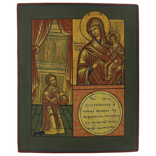 Russian Icon Unexpected Joy on antique panel 37x30 cm. Inspired by the story of the holy bishop Dimitrij of Rostov, this orthodox icon depicts a sinner who, praying before a Madonna icon, receives the gift of repentance and divine mercy, finding unexpected joy. The depiction shows the sinner kneeling on the left, while the Madonna with the Child appears on the top right. The inscription at the bottom contains the beginning of the story written by Dimitrij of Rostov.