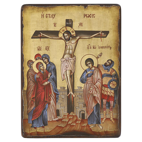 Hand-painted Romanian Crucifixion Icon with antique finish, 40x30 cm