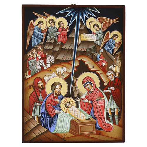 Hand-painted Romanian Nativity Icon, 40x30 cm. This Nativity icon was created by artists of the Byzantine iconographic school and depicts the complete scene of Christ's birth with the traditional figures. The work is carefully detailed and features gold leaf in key areas, such as the halos and the crowns of the Magi, to lend light and solemnity to the image. At the center is the Mother of God, shown in the garments assigned by iconographic tradition; her head is bathed in divine light and the marks on her mantle recall her perpetual virginity. Beside her is the Baby Jesus, God made man, laid in a stone manger. The donkey and the ox watch over the Child, who lies in a rectangular crib symbolically recalling a tomb and is wrapped in tight swaddling according to ancient tradition. The angels and Saint Joseph are arranged with balanced composition. On the back of the icon there is a small explanatory booklet illustrating the meaning of the depiction, together with the iconographer's signature, which guarantees its originality and handcrafted execution. This Nativity icon is delivered in a red box to ensure proper preservation and protection during transport. Actual measurements: 40x30x2 cm.