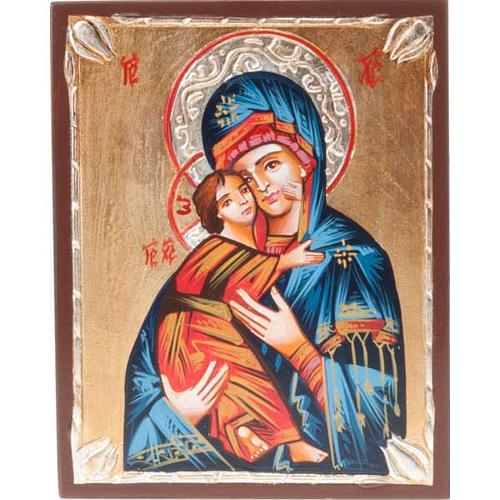 The Virgin Jachromskaja is one of the Virgin of Tenderness, the face of Jesus is close to that of Mary and they express a feeling of tenderness. According to the tradition, this Virgin appered to Saint Cosma and healed a sick old man. It is hand-painted according to the ancient iconographic technique and come in an elegant blue velvet box with internal satin covering.