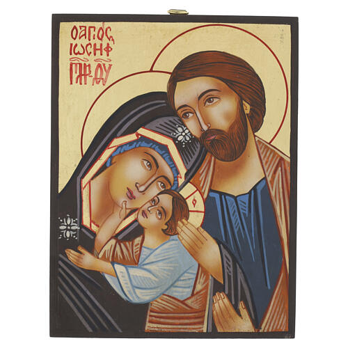 Romanian Holy Family icon with gold leaf, 18x15 cm. This orthodox icon depicts the Holy Family and is executed according to the Byzantine iconographic tradition. The scene shows the Infant Jesus tenderly touching his Mother's face as he seeks her gaze, a gesture full of affection and intimacy. Saint Joseph stands beside Mary, gently placing his hand on her arm as a sign of protection and silent presence. Enriched with gold leaf that gives luminosity to the whole and highlights the details, including the traditional inscription in the upper left, the colors and gestures create a harmonious image rich in spiritual meaning. The Holy Family icon is delivered in a red presentation box with a white satin interior to protect it during transport and ensure correct preservation. It is accompanied by a certificate of authenticity attesting to the iconographer's work and its handcrafted origin.