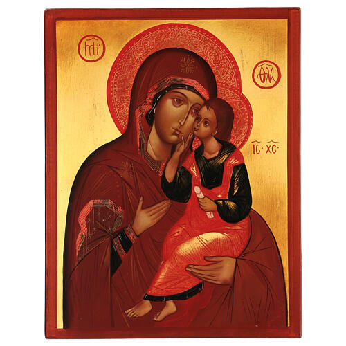 This icon, the original of which is in the State Museum of Petersburg, depicts Our Lady Clement holding the infant Jesus. The two characters look at each other softly and their cheeks are leaned against each other. The child gently touches the face of the Madonna with one hand and holds a roll of paper with the other.From this icon transpires the love and solid bond that is created between mother and child. It is ha...