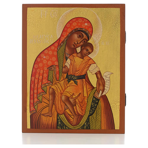Our Lady of Kykkos Russian Icon, 21x17 cm. This icon is hand painted in Russia following the rigorous rules of the orthodox iconography. This icon comes in an elegant blue velvet box with internal satin covering and provided with a certificate of authenticity and warranty.