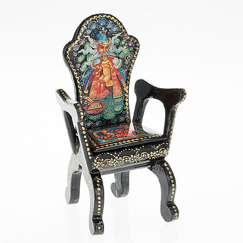 The lacquered box has the particular shape of a chair with a pullout back chair and depicts two traditional Russian images: Grandfather frost (a fictional character who in some Slavic cultures plays a role similar to that of Santa Claus;) and the Troika. The box is made in Palekh by the painters of the University of Fine Arts. All the decorations are made in tempera and gold by using just one squirrel hair paint brush and egg tempera.