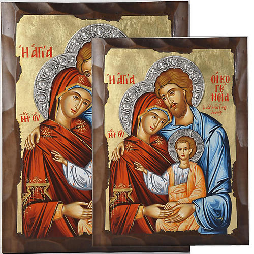 Icon of the Holy Family, thsi icon is manufactured with the screen-printing technique applied on a wood plate and hand-decorated. The circle of love is represented by the position of the faces and hands, the nimbus of the Holy Family is in silver and in relief. This icon comes in an elegant blue box with internal satin covering.