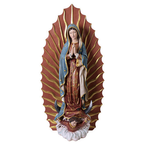 Our Lady of Guadalupe statue in wood-effect painted fiberglass. The Catholic fiberglass statue is hand painted to resemble wood and depicts the Virgin of Guadalupe. The figure shows the Virgin in a contemplative posture with hands joined, head slightly inclined and gaze directed downward, wrapped in a large mantle decorated with stars that falls along the body and covers the underlying garment. At her feet an angel with outstretched wings supports the figure, which rests on a cloud-shaped base. A large rayed aureole with gilded elements develops at the back, framing the entire composition and recalling the traditional iconography. The painting precisely defines the decorations, the folds of the fabric and the facial features, creating a harmonious unity between the different parts of the statue. Crafted by artisans from Val Gardena with workmanship inspired by carving tradition, the Lady of Guadalupe statue is supplied with an integrated base that guarantees stability and support.