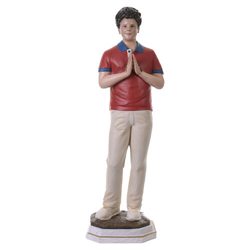 Saint Carlo Acutis statue in fiberglass with glass eyes, 125 cm (49.21 in) tall with a 38 x 34 cm (14.96x13.39 in) base. The Catholic figure depicts Saint Carlo with hands joined in prayer and a composed posture, wearing modern attire: a short-sleeved red polo with blue trim at the collar and edges, cream trousers and light shoes. A small raised rosary hangs from his right hand, reinforcing its devotional character. The expression is direct, with crystal eyes that enhance the naturalism of the f...