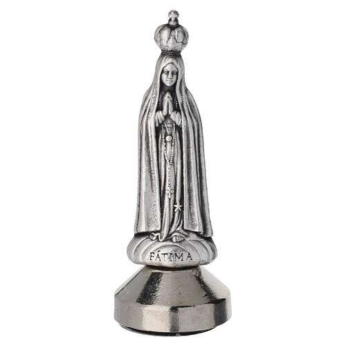 Our Lady of Fatima figurine with magnet and silver finish. Die-cast zamak figure depicting the Madonna of Fatima in a praying pose with a crown, mounted on a magnetic metal base. Slim, elongated shape with relief detailing and a uniform matte surface; the word Fatima is engraved at the base. Italian-made by die-casting with a silver electroplated (galvanic) finish over the entire surface. Suitable for display on metal surfaces. Overall height 6 cm with a circular base 2 cm in diameter.