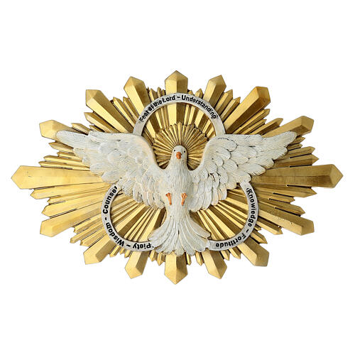 Dove Statue with the Seven Gifts of the Holy Spirit Resin 15x25 cm. This picture depicts a white dove, symbol of the Holy Spirit, surrounded by golden rays radiating outward to represent divine light spreading. Measuring 15.5x24 cm, it features a hook on the back for easy hanging on any wall. Ideal for enriching spaces dedicated to spirituality, such as a prayer room, a home chapel, or as a blessing symbol for sacraments or religious celebrations.