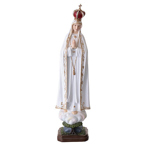 Lady of Fatima statue 60 cm painted resin on a Tree of Life. Resin Catholic statue of Our Lady of Fatima, hand-cast and finished with hand-painted details. The Virgin stands on a cloud with her hands joined in prayer and her gaze directed forward, wearing a light tunic and a long mantle that covers her head and falls along the figure. A crown topped with a cross rests on her head, and a golden cincture decorates the waist of the robe. Beneath the cloud, the Tree of Life completes the base of the composition. Actual measurements: height 60 cm, width 16 cm, depth 13 cm.