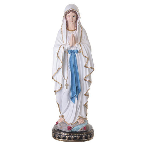 Our Lady of Lourdes outdoor statue in painted fiberglass, 120 cm. Fiberglass depiction of Our Lady of Lourdes, cast in fiberglass and hand-painted. The figure stands with hands joined in prayer, wearing a light-colored robe and a cloak that covers the head and falls along the sides with gold-trimmed edges. A blue sash at the waist descends at the front, and a rosary with a cross is visible at her side. At her feet the statue rests on a base with rocky elements and floral details, bearing a frontal inscription dedicated to Our Lady of Lourdes. Dimensions: height 120 cm; width 40 cm; depth 30 cm. Treated for both indoor and outdoor use.
