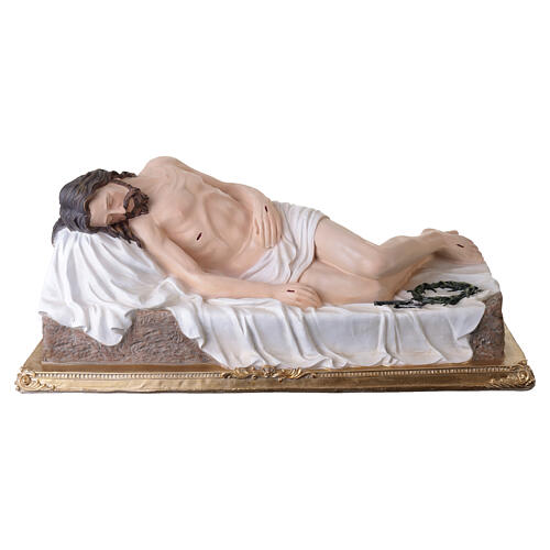Painted fiberglass statue of The Dead Christ on a stone slab, height 35 cm. Depiction of the Dead Christ in fiberglass and then hand-painted. The figure is represented lying on a surface covered by a light shroud, the body resting on one side with the legs slightly bent. The head is turned to the side with well-defined hair and beard; the arms lie alongside the body, one hand resting on the chest and the other along the flank. On the shroud are placed the crown of thorns and the nails beside the body, recalling the elements of the Crucifixion. The base is a rectangular slab with a rim decorated by raised floral motifs. Actual measurements: height 35 cm, width 80 cm, depth 40 cm.