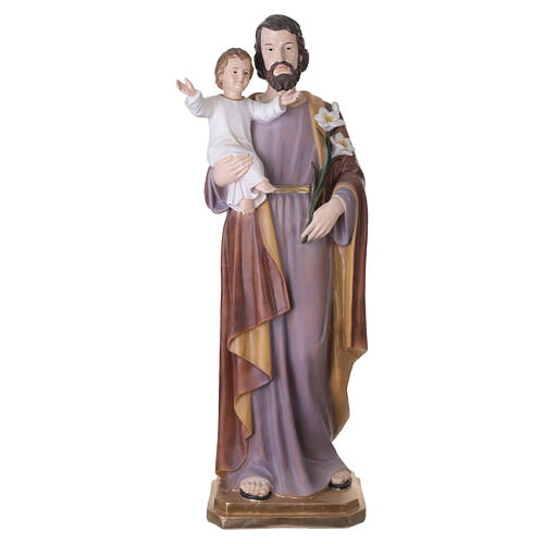 Fiberglass Catholic statue of Saint Joseph with Baby Jesus, 120 cm, suitable for indoor and outdoor use. The figure is cast in fiberglass and hand-painted. Saint Joseph is depicted standing, wearing a robe in violet tones and a mantle with red and gold accents along the sides. He supports the Baby Jesus on his arm and holds a lily with white blossoms in his other hand. The Child is shown in a light-colored robe with one hand raised in blessing, facing forward. The base is shaped with a wood-effe...