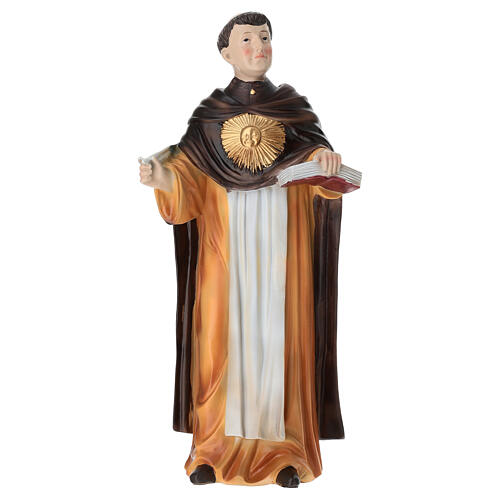 Saint Thomas Aquinas painted resin statue 28 cm. The Catholic statue depicts Saint Thomas Aquinas in the typical black and white garb of the Dominican order. He holds an open book in his left hand, symbolizing his extensive work as a writer and theologian, while gripping a goose feather pen in his right, representing his tireless research and contemplation. A golden ray with a sun emblem on his chest signifies the wisdom and light that guided him in faith. Crafted in resin and hand-painted, with...