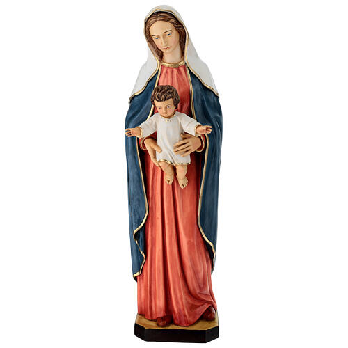 Virgin Mary and Child Statue, 80 cm, painted resin. This Christian statue is crafted with harmonious colors and refined details that enhance the sweetness and sacredness of the figure. The Virgin Mary wears a serene tone red dress, symbolizing love and sacrifice, draped in a blue mantle representing wisdom and divine protection. Her head is veiled in white, signifying purity and heavenly grace. The Baby Jesus, dressed in white, is cradled in the Virgin's arms with outstretched hands, as if presenting himself to the people, symbolizing his role as the Savior of the world and his offering of love for humanity. This detail adds a symbolic value to the statue, evoking the moment of the Presentation in the temple and his journey of redemption. The finely decorated edges of the garments are adorned with golden accents, exuding elegance and prominence to the entire composition. Produced in Italy by a historic company established in 1900, specializing in creating sacred statues. Each detail is meticulously hand-finished by artists, ensuring a unique and finely crafted work. Ideal for churches and chapels, this statue is also a perfect gift for those devoted to Virgin Mary with Child and her message of love, hope, and protection. Statue dimensions: 78.5x20.5x19 cm. Made in Italy.