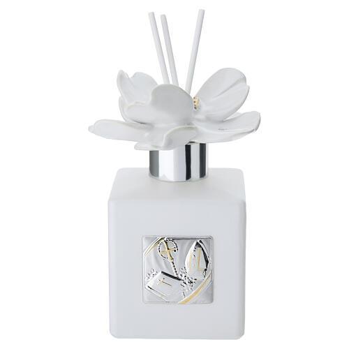 200 ml room diffuser decorated for Confirmation, ideal as a favor or symbolic gift for the sacrament. The glass bottle is embellished with a decorative flower and includes reed sticks for gradual fragrance diffusion. The attached two-tone gold and silver plaque depicts a mitre and pastoral staff, symbols of Confirmation. A table piece suitable as a keepsake for guests and family. Capacity: 200 ml. Size: 13 x 6 cm.