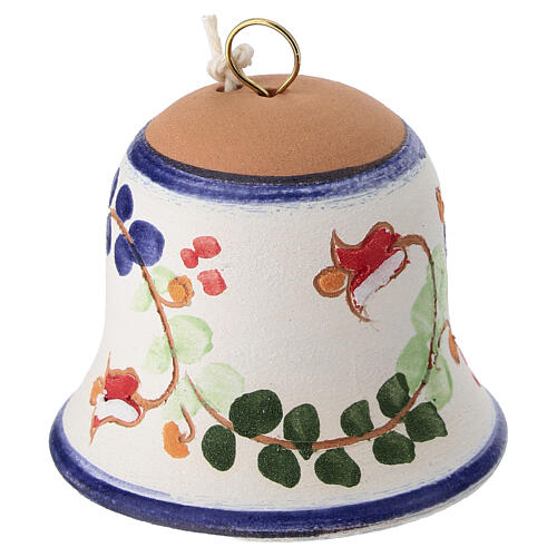 Blue floral Deruta terracotta bell ornament, 5x5 cm. Bell ornament crafted from glazed terracotta with a hand-painted floral decoration in shades of blue, green and orange, produced in Italy using traditional artisanal techniques. Light background with stylized vegetal motifs; upper rim and base finished in blue, top section left in natural terracotta and fitted with a gold-tone metal hanging ring. Made in Deruta, Umbria, a locality renowned for its artistic terracotta production, following deco...