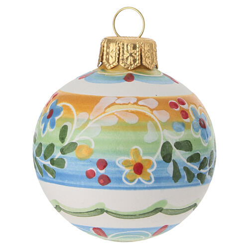 Floral Deruta terracotta Easter ball, 5x5 cm. Round ornament crafted from glazed terracotta with a hand-painted polychrome floral decoration, made in Italy. A central band in yellow-green and blue shades is enriched with stylized raised flowers and leaves; the lower section is white with a wavy border and the top is finished with a gold-tone cap fitted with a metal hanging hook. Produced in Deruta, Italy using artisanal techniques rooted in the tradition of decorative terracotta craftsmanship. S...