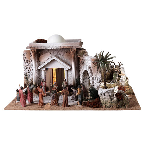 Easter nativity Death sentence scene vegetable garden olive trees 9 cm 35x60x40 cm MODULE 4.This Easter nativity scene setting is designed to represent various scenes from the Passion, but in particular the Garden of Olives, with Jesus addressing his father, and his death sentence, with the people praising him.This module is handcrafted in Italy in wood, with decorations in cork and moss. It also includes lights to be able to illuminate interior spaces and scenes.In order to power the lights, you need to connect the 220V European power cables.The module measures 35x60x40 cm and is available in two variants: empty and with figurines. The statues have a height of 9 cm.This setting can be combined with products PR029764, PR029765, PR029766, PR029768 and PR029769 to create a complete Easter nativity village. The 6 modules can also be purchased together, ready to assemble, by searching for item PR029763 on Holyart.