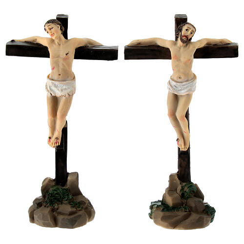 Passion figures of two thieves on the cross 8 cm. Handcrafted colored resin figurines representing the two thieves on the crosses next to Jesus. Dimensions 8.5 cm in height and 4.5 cm in width. Suitable for a 5 cm nativity scene.