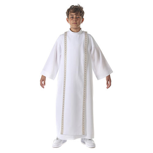 This white first communion alb with scapular with golden edges is entirely made in Italy in polyester.