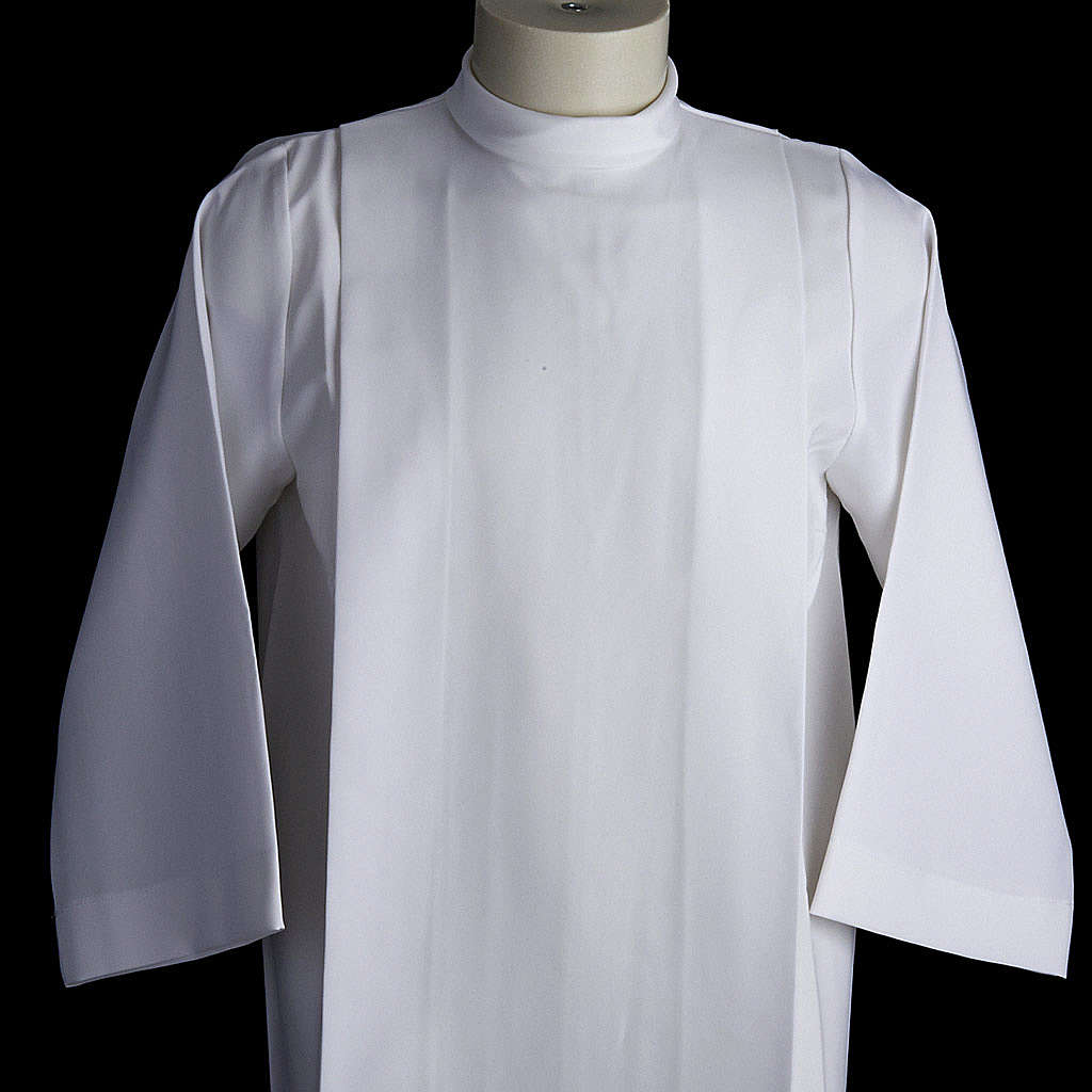 This white first communion alb with 2 pleats in front and back is entirely made in Italy in polyester.