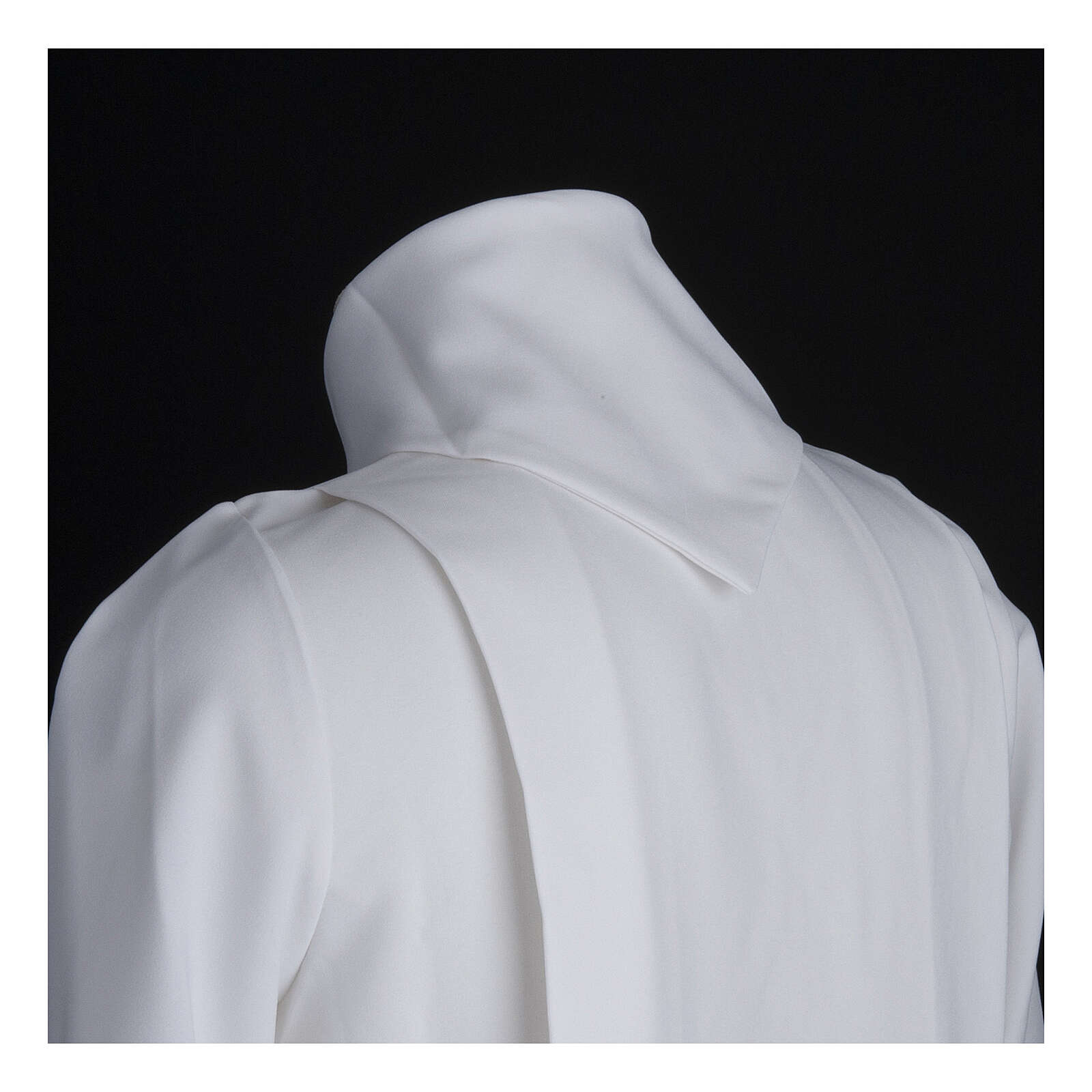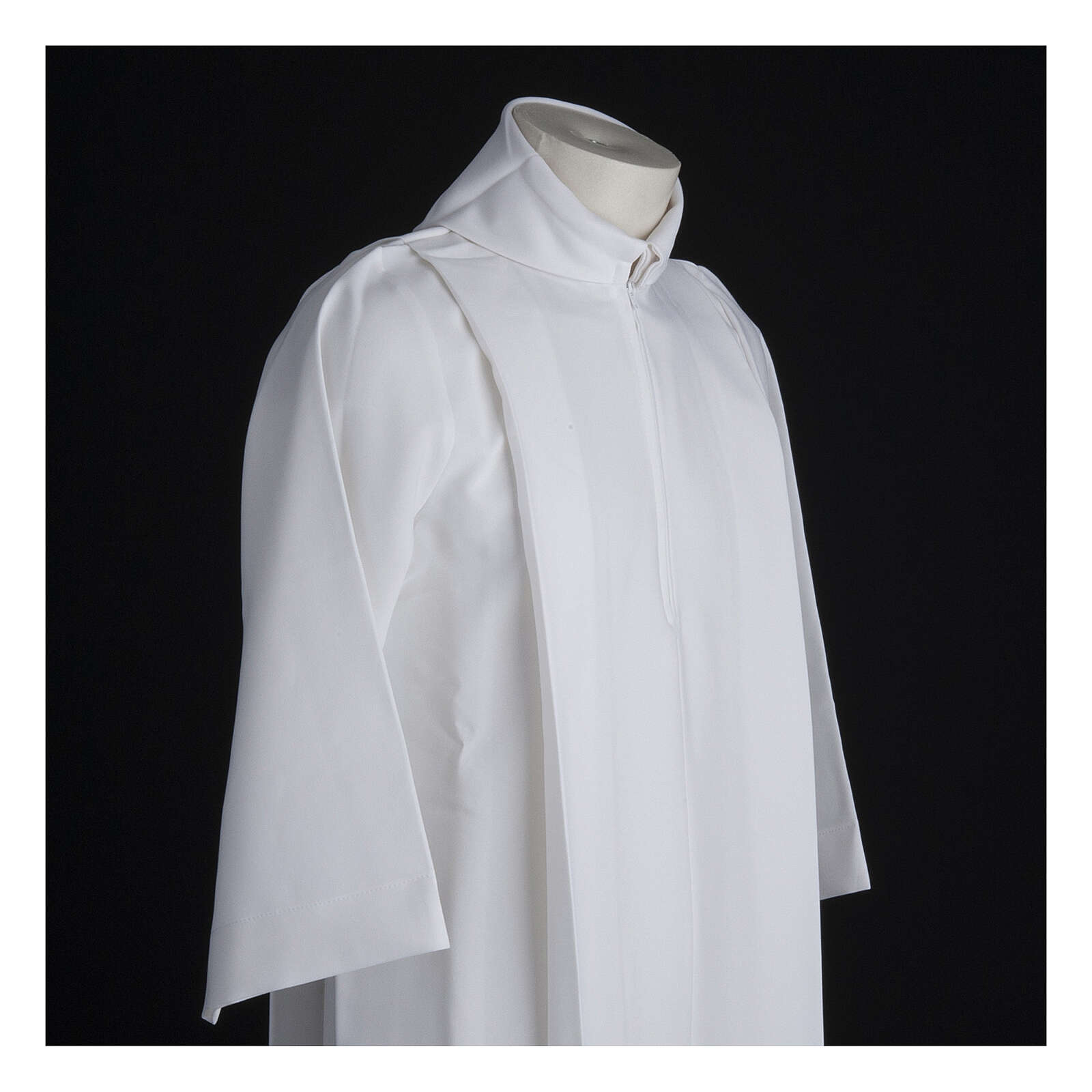 This white first communion alb with 2 pleats and fake hood is entirely made in Italy in polyester.
