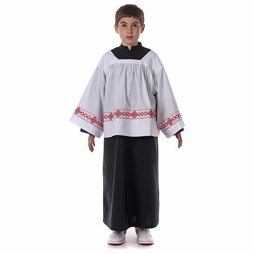 Server surplice and black cassock. This altar server vestment is entirely made in Italy in polyester, it includes a white surplice and a black cassock. Available in the following standard sizes in centimeters: