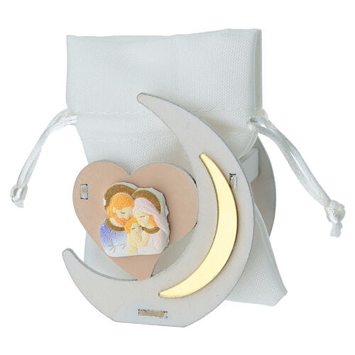 Wooden Confirmation favor in a crescent-heart design depicting the Holy Family, measuring 8 x 6.5 cm. Supplied with a 10 x 7 cm fabric pouch with two drawstrings for easy closure. An elegant and symbolic keepsake, perfect as a gift for Confirmation and for families wishing to commemorate this special sacrament.