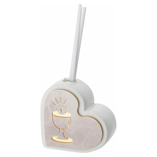 First Communion favor heart diffuser, 7x7 cm made in Italy. On the front, there is a decoration with a chalice and host, symbols associated with the First Communion sacrament. Compact size, ideal as a keepsake or gift for First Communion. It includes reeds for fragrance diffusion. Made in Italy.