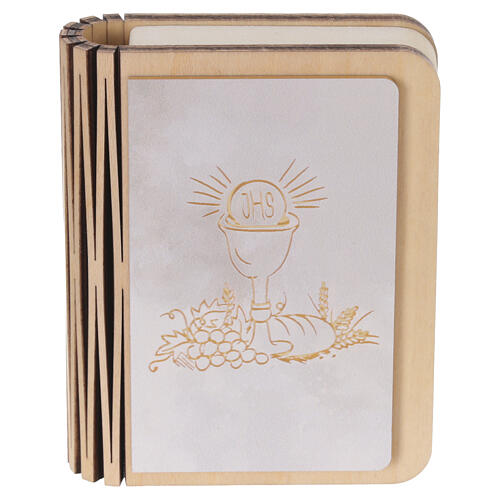 First Communion favor shaped like a book with an integrated, rechargeable LED light. The front is decorated with a chalice, host and the JHS monogram, symbols linked to the sacrament. Closed it measures 10x8 cm; when opened it reaches an approximate width of 15 cm. The light switches on automatically when the book is opened and alternates between warm white and cool white. Simple and intuitive to use, designed as a tabletop keepsake. Rechargeable via the included USB-C cable. An instruction sheet inside explains the product’s operation.