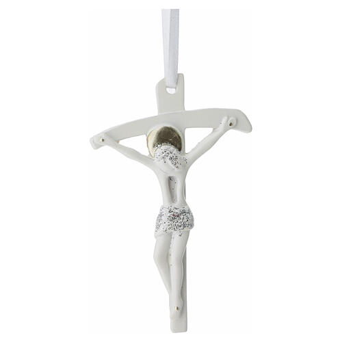 Resin religious favor white stylized crucifix with bow 9x6 cm