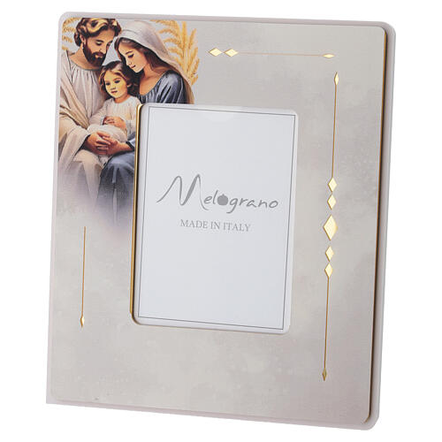 Tabletop photo frame featuring a depiction of the Holy Family, conceived as a decorative and symbolic object. Made in Italy, it is designed to hold a photograph measuring 8.5 x 6.5 cm. Its compact size makes it suitable for furniture, shelves or bedside tables. Fitted with a metal easel back decorated in glossy gold, which provides stability and support. Actual frame dimensions: 16 x 13.5 cm.