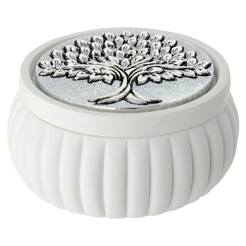 Silver-plated Tree of Life favor trinket box, 4x7 cm. White resin box with a lid decorated by a refined silvered Tree of Life in relief. The box measures 4.5 cm high with a circumference of 7.6 cm. Designed by Bagutta, a dynamic company founded in 2000 in Bergamo, specializing in gifts, favors, home accessories and stationery. With a solid presence in Italy and across Europe, Bagutta stands for style, attention to detail and excellent quality.