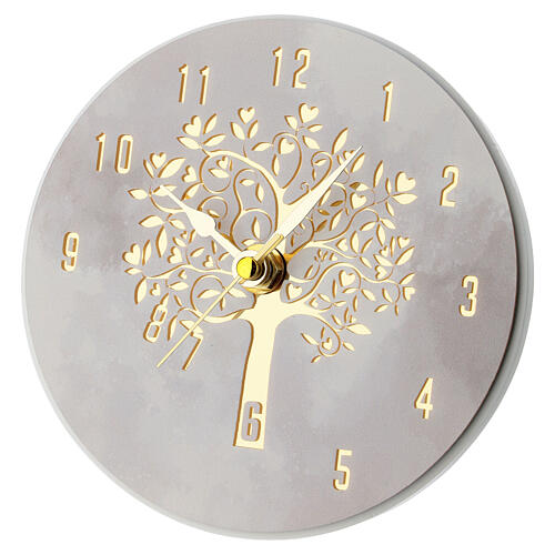 Tree of Life table clock favor. The piece features a Tree of Life motif with numbers and hands in glossy gold, designed as a keepsake. Fitted with a rear fold-out easel for stability and good visibility on furniture, shelves or desks. With the easel open it reaches a depth of 9 cm. Made in Italy. Battery operated. Power: 1 AA battery (not included). Diameter: 14.5 cm.