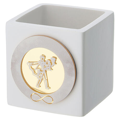 White box wedding favor with a decorative plaque depicting a bride and groom and an infinity symbol beneath. Its simple shape makes it suitable as a container for sugared almonds or small gifts. Designed as a symbolic keepsake for weddings, it is ideal as a favor or a small decorative object for display and for use in wedding arrangements and event setups. Made in Italy. Dimensions: 6x6x6 cm.